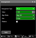Objects can be arranged in several ways like:- Moved along the X,Y,Z axis- Moved along a circle line in X,Y,Z space- Arrange in a 2D matrix Corresponding to the grandMA2 console alignment function objects can be arranged in relation to the origin object like:- <, >, ><, and <>If the 'Relative’ flag is set every push of the 'Apply’ button increments the arrangement by the given value. Note: The origin is 0,0,0 if the 'Relative’ flag is off. Otherwise it is the own position. |