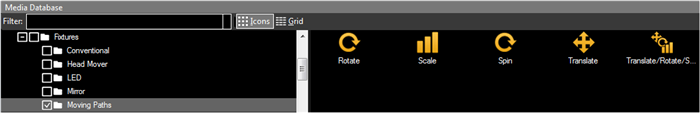 Moving Paths are managed like fixture types in the desk. To setup a Moving Path, create a new fixture in the desk from the library. Choose the Manufacturer 'MA Lighting’ and the type 'Moving Path…’. There are several types of Moving Paths. The type (Rotate, Scale…) specifies the parameters controlled by the desk: