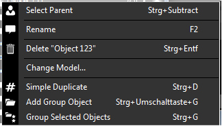 Short right mouse click Menu for selecting, renaming deleting duplicating or grouping selected object |