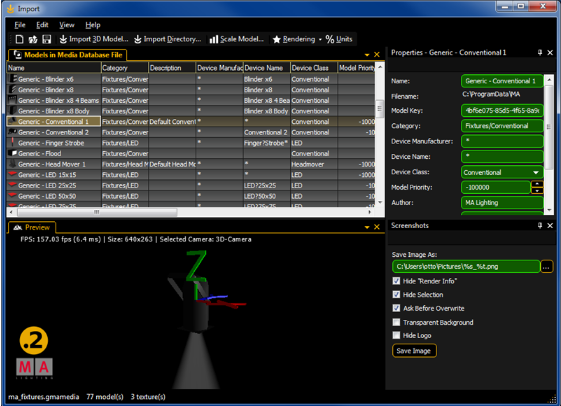 The imported model can be viewed in the 'Model Test Area’ window that can be operated similar to the 3D 'Stage View’. Properties like 'Name’; 'Category’ etc. can be edited. After that the model can be stored in the media database and is ready to be used in dot 2 3D.