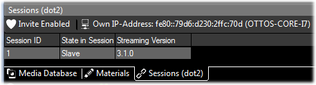 The Session window gives an overview about all running sessions in dot 2 net. The streaming version is important for the compatibility between 3D and console. |