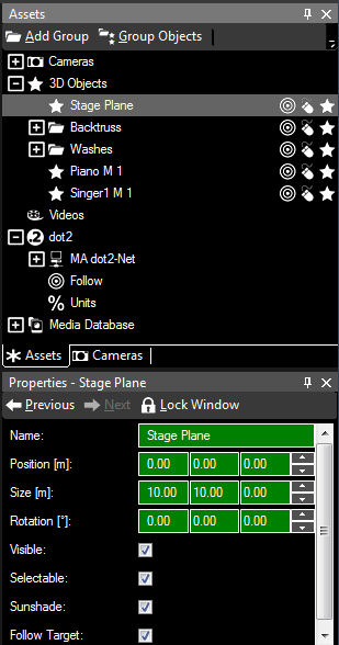 It is useful to have them both visible together. If you click on an element in the assets window, its properties are shown below. The Assets window lists all used objects and fixtures in a tree. Select an object in the tree and the object will be marked in the Stage View and 3D Object grid too and vice versa. The assets window is a tree structure view including
