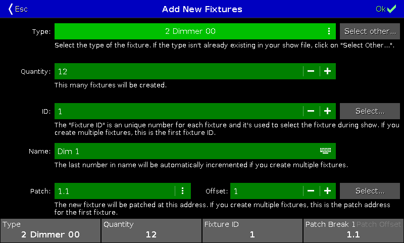This will now displays the Fixture Setup view (and now with fixtures in it). You can use the rightmost encoder to scroll through the list. If you done it right, then you'll have 12 dimmers with ID numbers '1' to '12' and patched from address '1.001' to '1.012'.