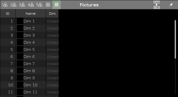 The last version of the Fixture view is the Fixture Sheet View. This will also display all the fixtures in your show and they are sorted by the Fixture ID. This view also shows all the different attributes the fixtures have. Right now we only have fixtures with dimmers - so it's a bit boring. As we later add more fixtures with different attributes, this list will get bigger.