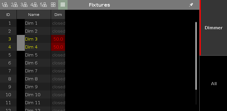 Notice how the fixture ID and name are yellow instead of gray. This shows us that these fixtures are selected - just as the yellow frame color in the Fixture Layout and Symbol views- and if you change the value, the fixtures will be affected.