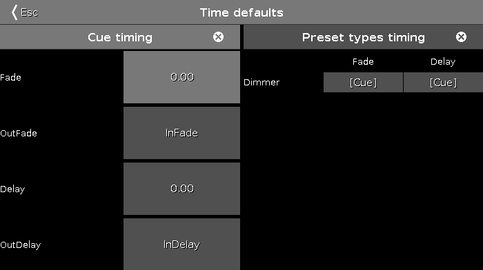 Here we can set a new default time that will be used when we store cue in the future. When we add fixtures with more preset types then these will appear on the right side of this view.
