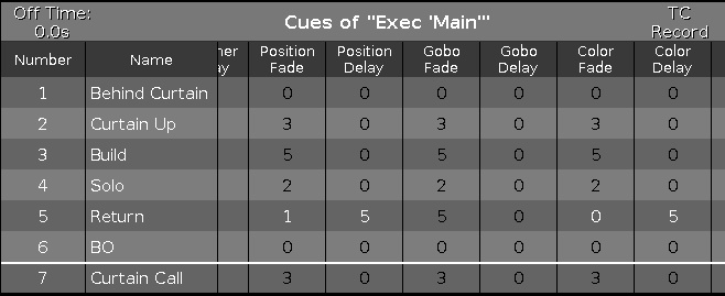 Have a look in the cue list. Since we added a lot of new fixtures, we can now use most of the time columns. Locate the Position Delay column and press and hold the cell where it interacts with cue 5. This should display the Calculator where you can set the delay time for all position moments in the transaction from cue 4 into 5. Set the delay to 5 seconds. Do the same in the Color Delay column. We can even fine tune it a little bit more. Since we now wait until the dimmer has faded out, we don't need then to do a position and color change in 5 seconds. The color is just a small internal part of the fixtures, so they can move in zero seconds. The pan/tilt movement is more visible and we should give it a little time to do the movement. Give it 1 second. This should be your final result: