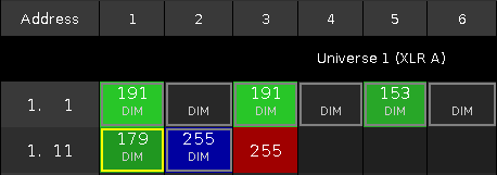 This view shows you the output from the console. It shows the actual DMX value of each DMX address. If an address have the value of 0 then it's not displayed. If there's something patched to a DMX channel then it'll have a gray frame around it. If it a fixture that uses more than one DMX channel then the frame will group the DMX channels that it uses.