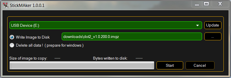 The MA StickMAker opens. - Select the USB drive, then click at the three dots and select the dot2*.imgz file. Click Start.