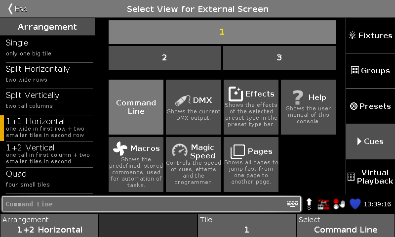 Once the screen is connected, you can turn on the console. Then you can press the Setup key and then the Select Views for External Screen. It could look like this: