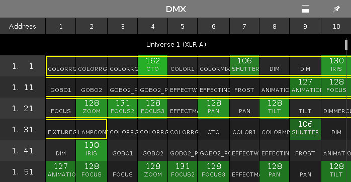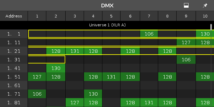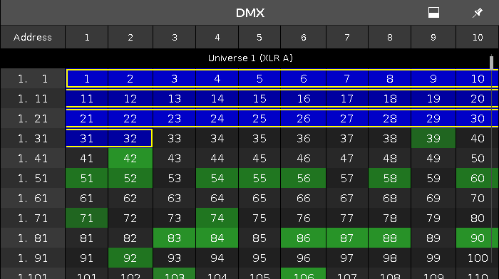 If one or more fixtures are selected in the fixtures view, the are displayed in the DMX view with a yellow frame around it.