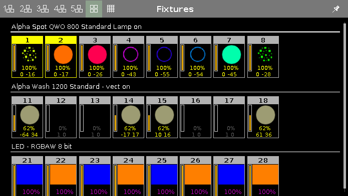 All fixture symbols have in the upper area the fixture ID and the orange dimmer bar below.