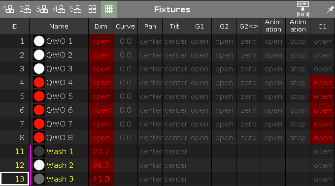 In the fixture sheet view are all patched fixtures, and their values and attributes, in a numeric order of the fixture ID.