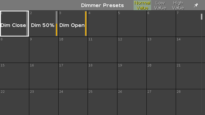 To go to the Dimmer Presets Pools View, select Dimmer in the preset type bar.