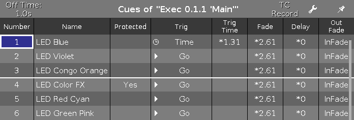 If the master rate fader is used, the trig time, fade, and delay times in the cue list are indicated by an asterisk *.