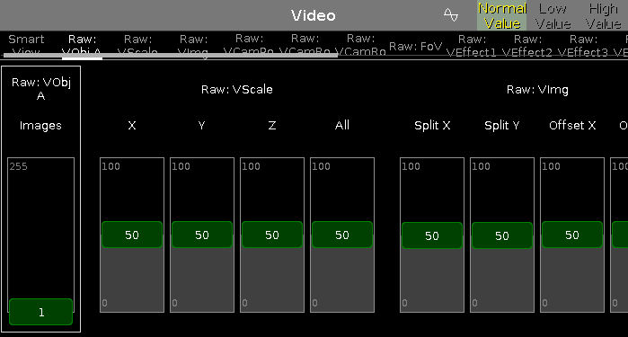 In the raw video view, you control the raw video values in natural values (0-100) of the selected fixture type.