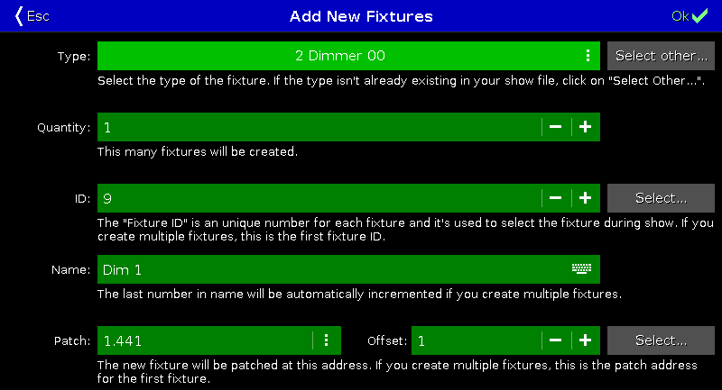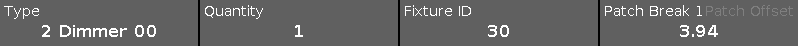 In this view, you select your fixture type, the quantity, the fixture ID, the fixture name, the patch address, and the offset.