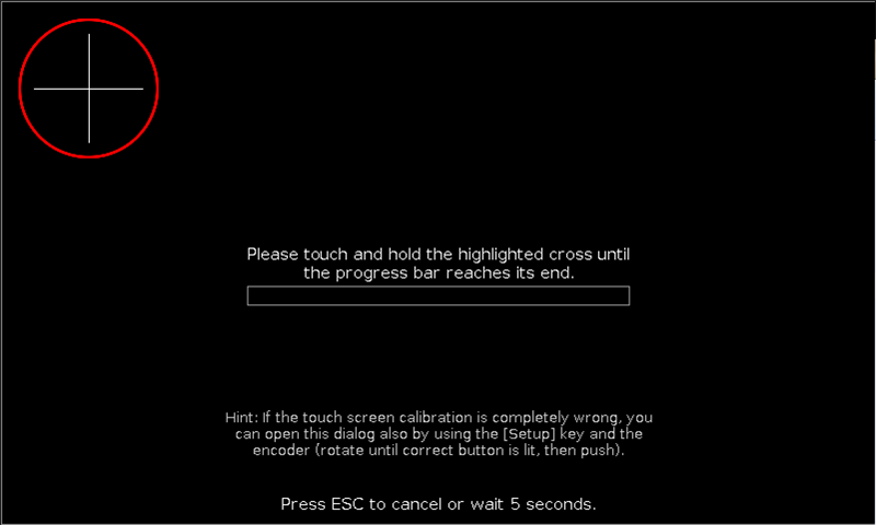 To calibrate the screen, touch and hold the highlighted cross until the progress bar is completed.