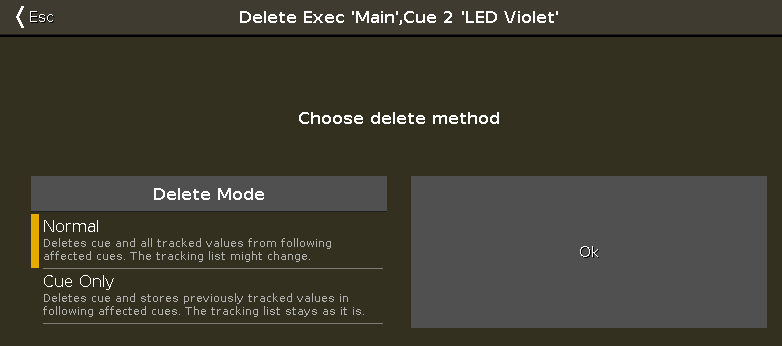 If you try to delete a cue from a cue list, the console ask to choose the delete method.