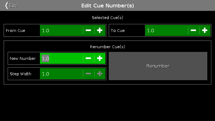 To leave the Edit Cue Number(s) Window, tap in the title bar or press Esc on the console.