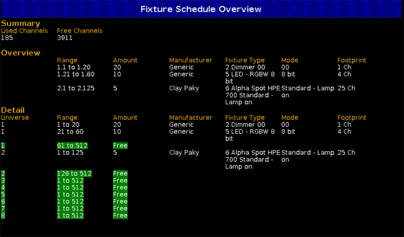 The Fixture Schedule Overview Window is located in the Patch and Fixture Schedule at screen 2.