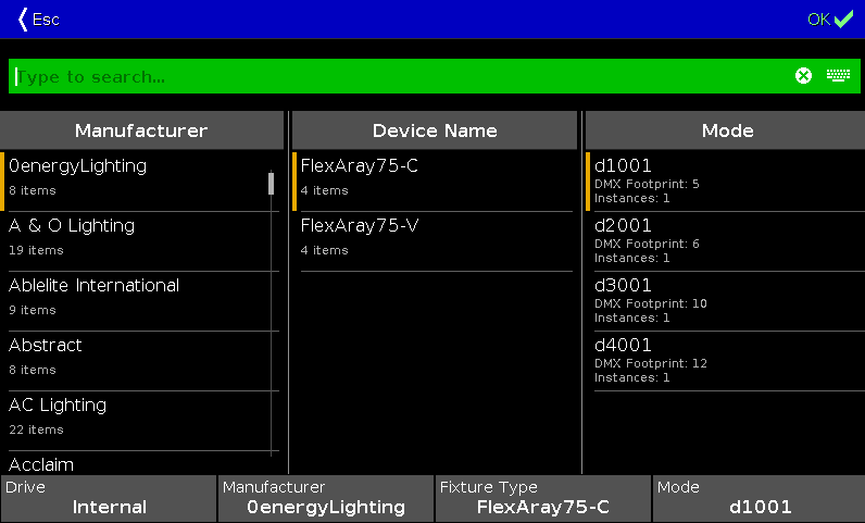 To search for a specific manufacturer, device name or mode: Tap at the right of the green edit line and type in.