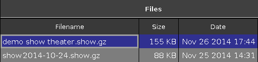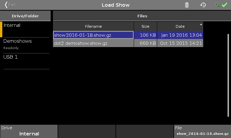 To load a selected file, tap OK in the title bar. The show file will be loaded and opens.