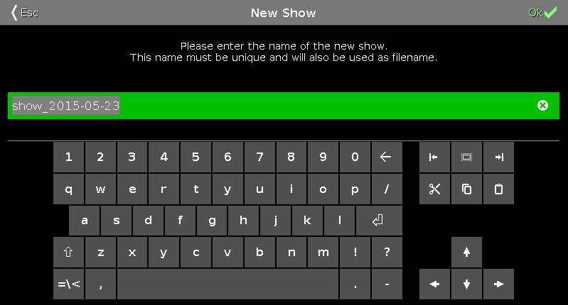 To create a new show file with the name in the green edit line, press the encoder.