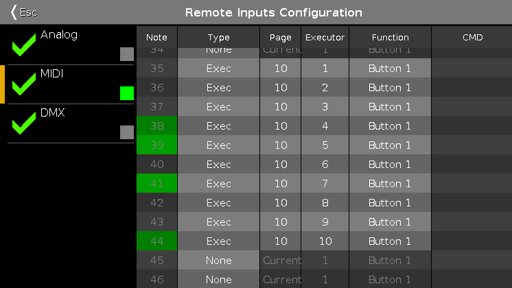 To enable or disable a remote input type, press the encoder. The current status is displayed in brackets.