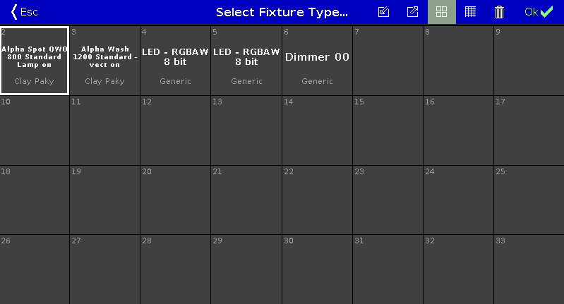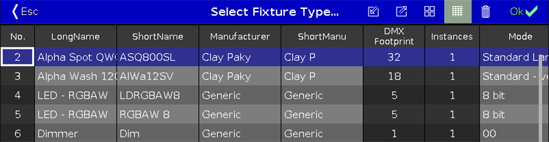 The Select Fixture Type... Window is located in the Setup, column Show, Patch & Fixture Schedule, tap Change Fixture Type or press and hold a cell of a Fixture Type.