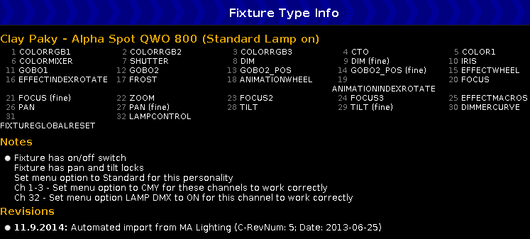 It displays at first, manufacturer, device name and mode in brackets, of the selected fixture type.