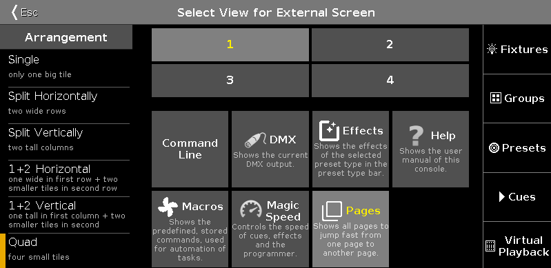 - On the console: Press Setup and then in the column Console, Select Views for External Screen.