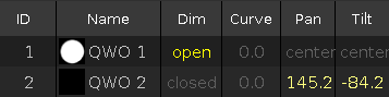 If you start cue 1, fixture 1 opens the dimmer to 100 % and fixture 2 will be prepositioned. If you start cue 2, only the dimmer of fixture 2 opens to 100 %.