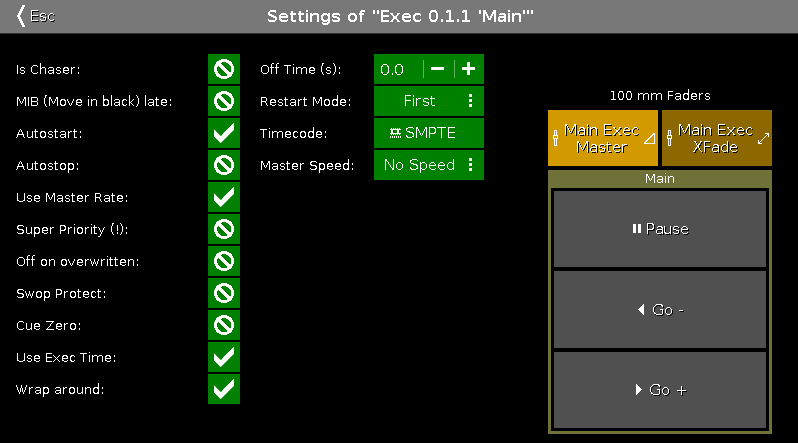 If an executor is a chaser and an off time is selected, the off time changes into an on and off time. The chasers start in the selected off time and end in the selected off time.