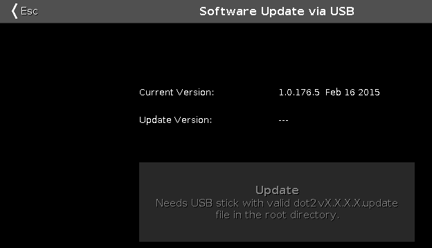In this window, you update the dot2 console via an inserted USB stick. Refer to, Getting Started Guide - Physical Setup and Layout.