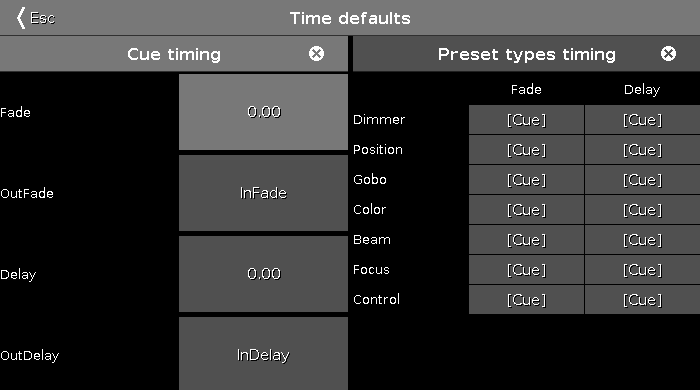 If a default timing is set, this time is always used for the following actions, e.g. store a cue.