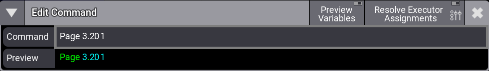 In the following example, Sequence 1 'FirstSong' is assigned to executor 3.201. If Resolve Executor Assignments is disabled, pressing executor 3.201 when inputting a command enters Page 3.201 in the command: