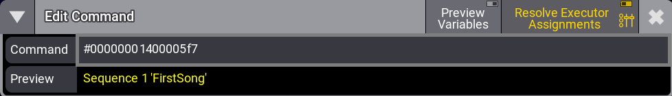In the following example, Sequence 1 'FirstSong' is assigned to executor 3.201. Pressing that executor when inputting a command when Resolve Executor Assignments is enabled, the handle of the object assigned to the pressed executor is entered in the command. The preview displays the object type, number, and name in yellow text.