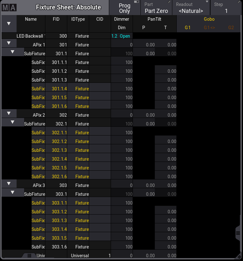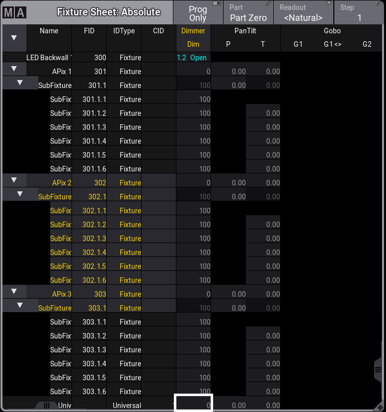 In this example all fixtures on the top level have to be selected: Fixture 301 Thru 303.1..