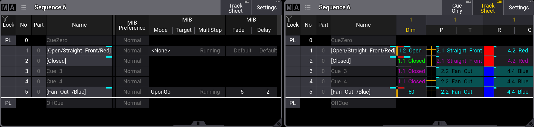 Attribute values will be displayed with special colors within the fixture sheet and the sequence sheet in track mode to show when the MIB is performed.