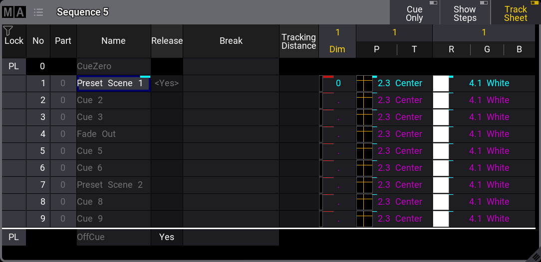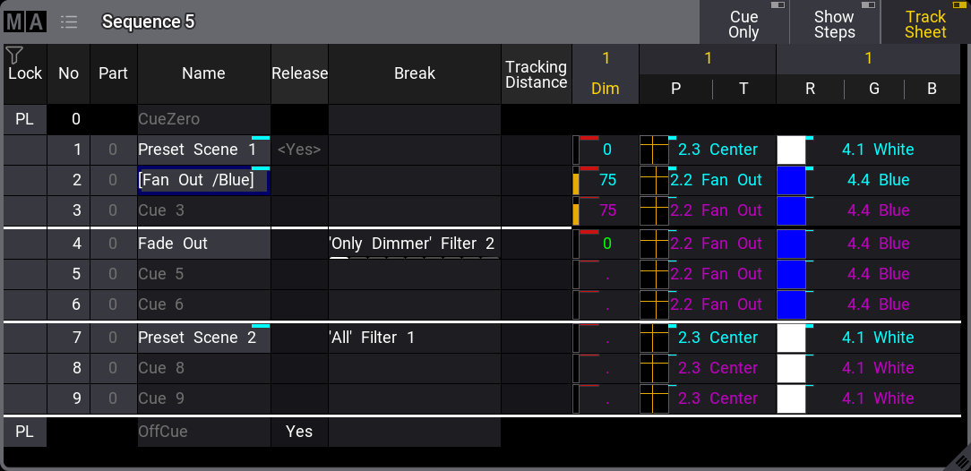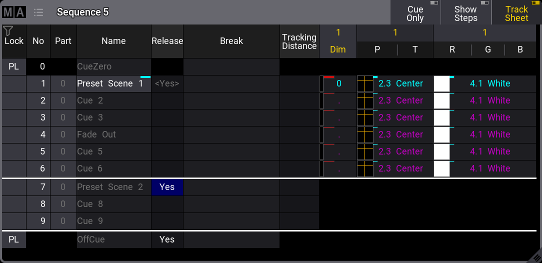 The values stored in cue number 1 are tracked from 1 to the end. The values are released in the OffCue because there is a Yes in the Release column.
