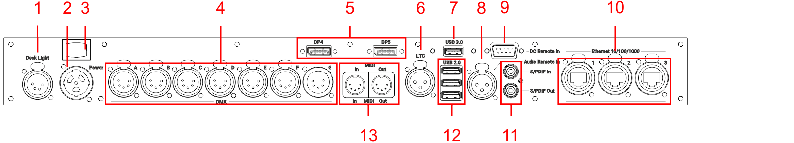 | For command line and graphical user interface access to an overlay showing the connectors on the back of the console, see the DMX Port Configuration topic. |