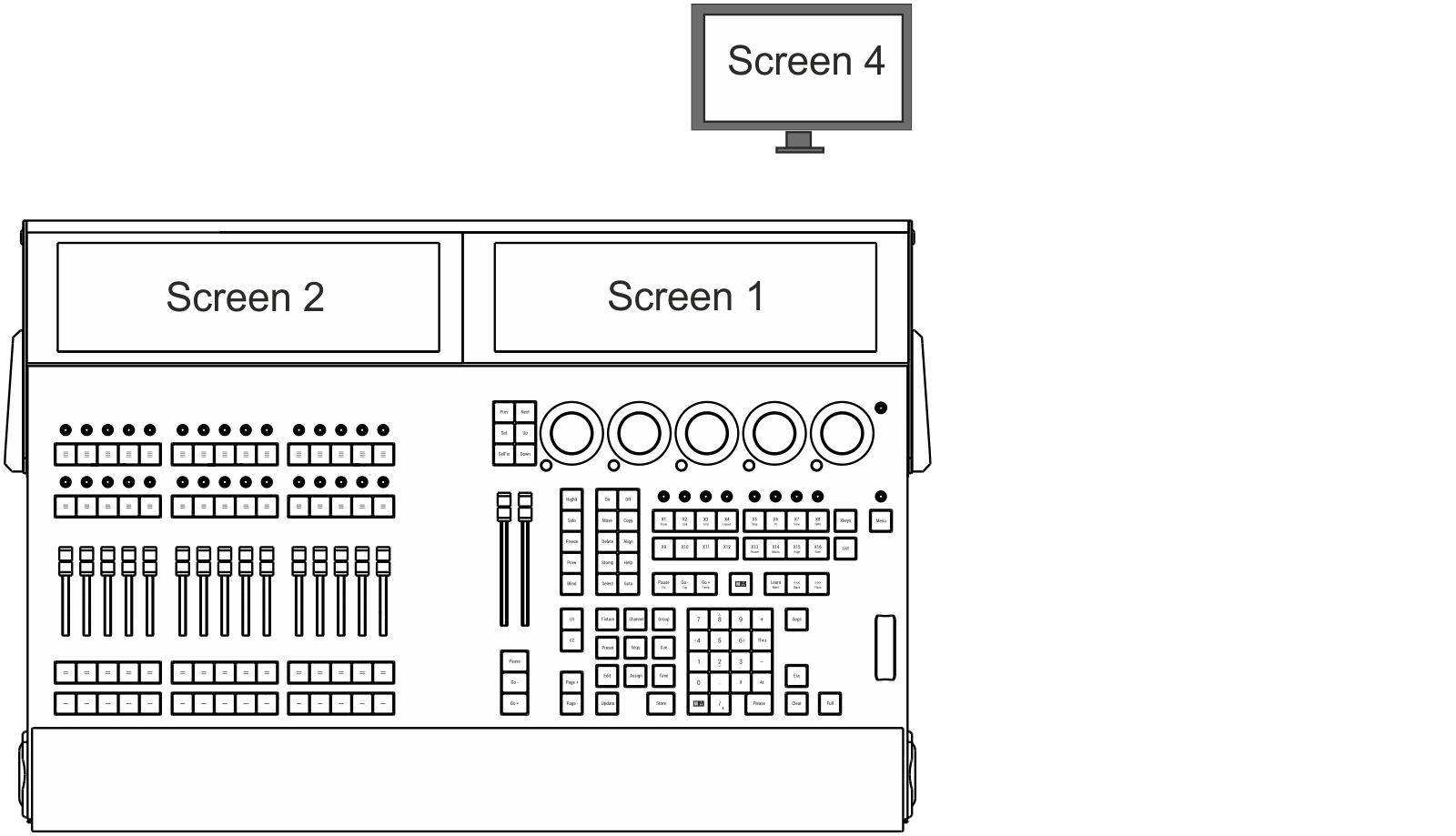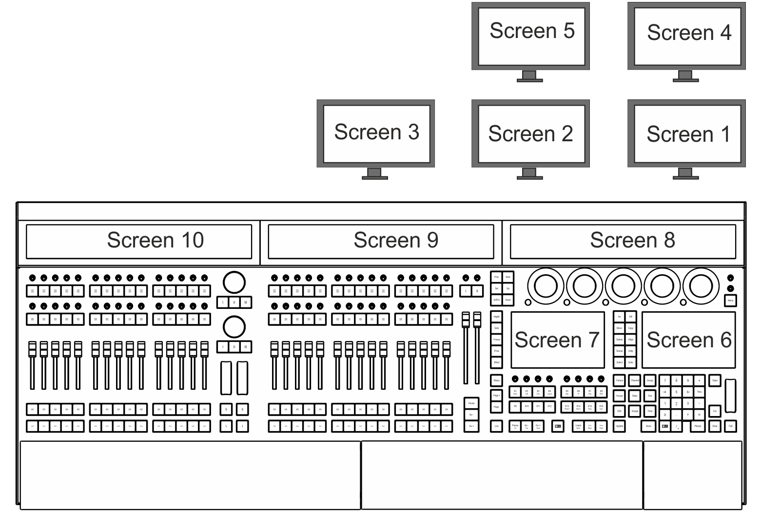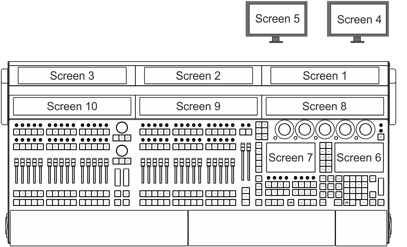 grandMA3 consoles number their screens in a specific order. Different consoles within the range have different amounts of internal screens and connections for external monitors. This topic covers those physical differences as well as the numbering system applied to those screens.