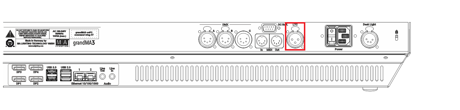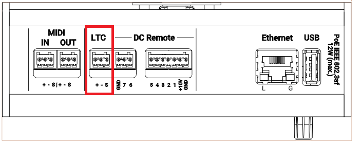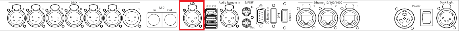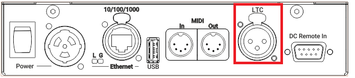 To synchronize the console with an SMPTE timecode source, connect an SMPTE source to the LTC port.