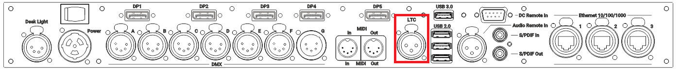 - Connect the SMPTE source to the LTC connector on the rear panel of the console.