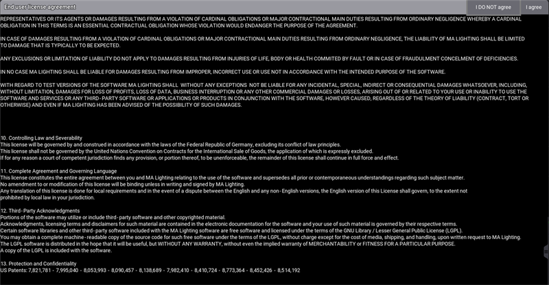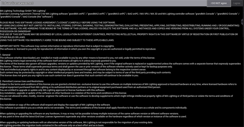 After selecting grandMA3 mode, the console starts to boot and the pop-up End-User License Agreement (EULA) opens.