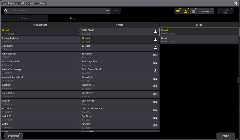 - Tap Import, the select fixture type library closes. The selected fixture is displayed in an orange font color: