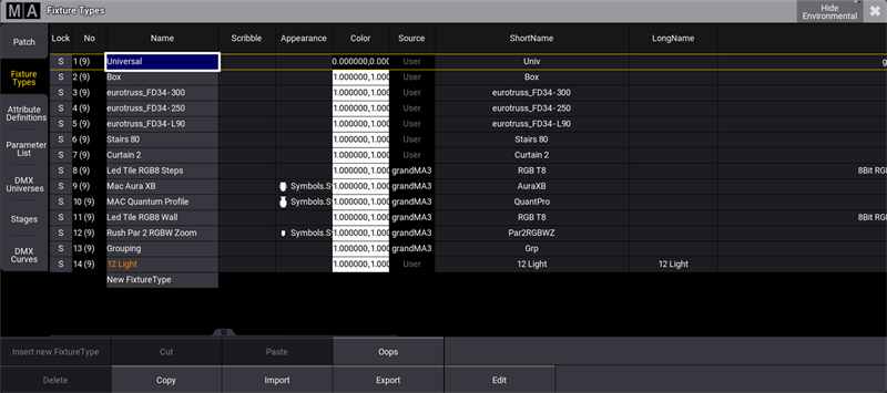 - Select the colored fixture type with a red or orange font color. To do this, go to the Fixture Types-tab in the Patch menu.