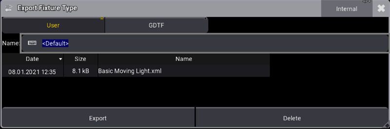 If an USB stick is inserted, the USB stick can be chosen. - To export the fixture type as grandMA3 format for only grandMA3 use case, tap at User.