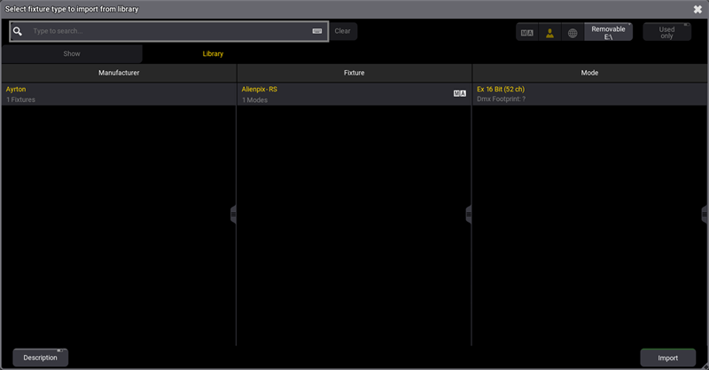 - Select a fixture type and then tap Import. The fixture is imported to the fixture type list and can now be patched.